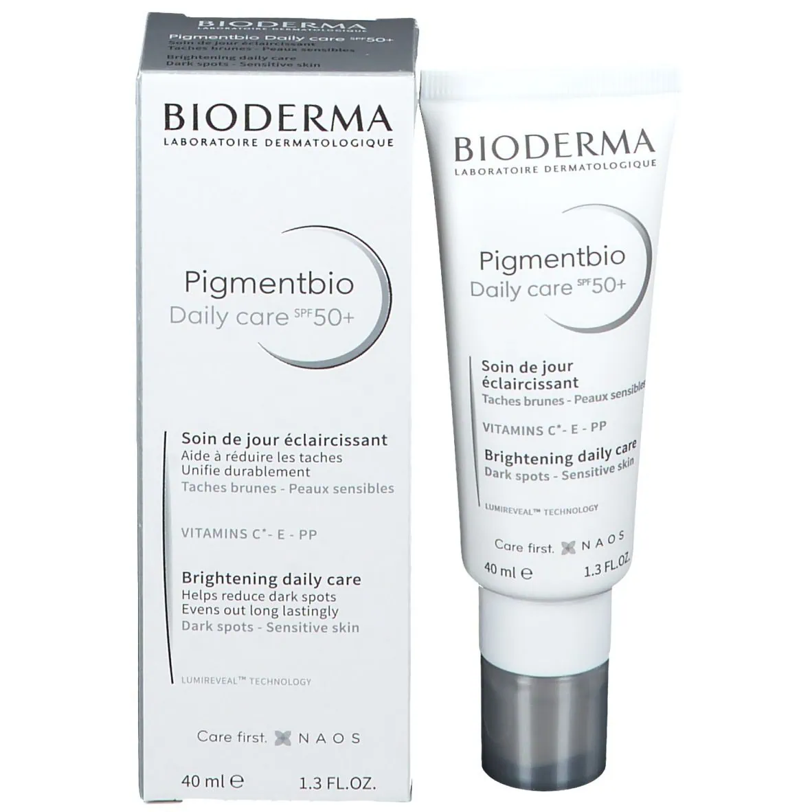Bioderma Pigmentbio Daily Care SPF 50+ est un soin de jour à utiliser quotidiennement pour protéger votre peau, prévenir l’apparition des taches brunes et éclaircir votre teint. Il bénéficie de filtres anti-UVA et UVB et d’un SPF 50+. Sa formule tire parti de la technologie Lumireveal qui met en lumière le teint originel. Ses actifs régulent la production de mélanine et stimulent le renouvellement cellulaire afin d’uniformiser le teint et de faire disparaître ces petites taches indésirables qui marquent votre visage. La crème de jour Pigmentbio Daily Care contient de la vitamine C et E qui sont anti-oxydantes et vont aider à l’éclaircissement de la peau. La vitamine PP permet hydrater durablement votre épiderme.